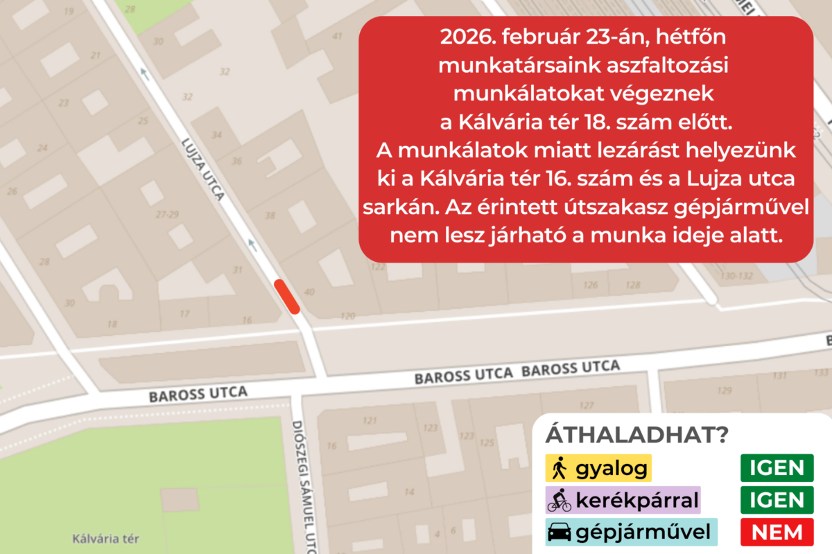 A javítás ideje alatt lezárást helyezünk ki a Kálvária tér 16. szám és a Lujza utca sarkán. Az érintett útszakasz gépjárművel nem lesz járható a munka ideje alatt.