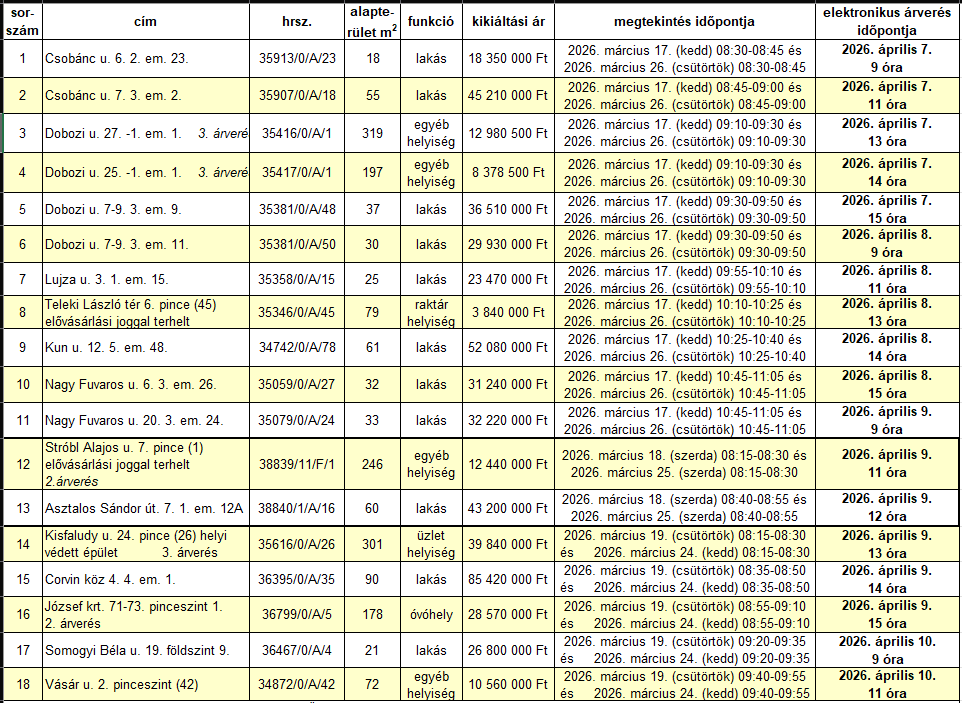 A Józsefvárosi Önkormányzat megbízásából a Józsefvárosi Gazdálkodási Központ Zrt. elektronikus árverés keretében 18 db önkormányzati tulajdonú ingatlan árverésen történő értékessel hirdeti meg 2026. február 26. és március 27. között.