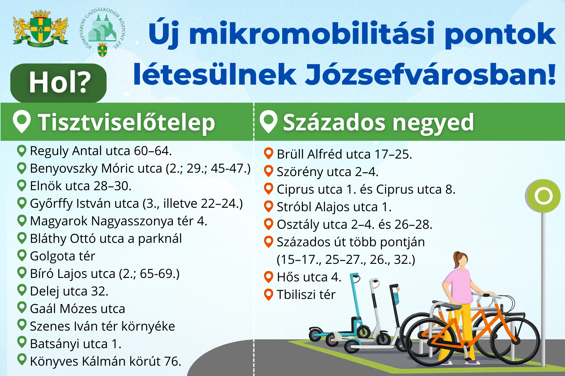Józsefváros Önkormányzata a közlekedési lehetőségek bővítése és a közterületek rendezettebb használata érdekében új mikromobilitási pontokat alakít ki a Tisztviselőtelepen és a Százados negyedben. A fejlesztés célja, hogy a közösségi mikromobilitási eszközök – például a bérelhető rollerek és kerékpárok – kijelölt, rendezett helyeken legyenek elhelyezhetők.