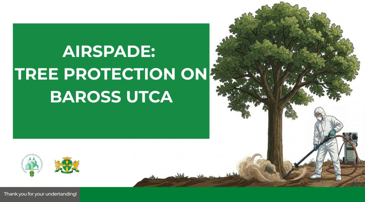 We are starting a special project to protect the trees on Baross utca 120–128. We will use a tool called AirSpade (Air‑Powered Soil Excavation) to help our trees stay healthy. What is AirSpade? AirSpade is an air-powered soil excavation tool used worldwide by arborists and landscape professionals to help maintain tree health. It is particularly suitable for sensitive tree-care operations such as vertical mulching, bare-rooting, radial trenching and soil aeration. Its proprietary supersonic nozzle converts compressed air into a high-speed, laser-like jet that quickly dislodges soil without damaging tree roots. What to expect during the work Schedule How you can help us To make the work fast and safe, we ask for your help with the following: Thank you for your understanding!