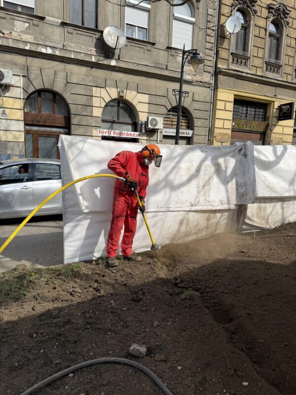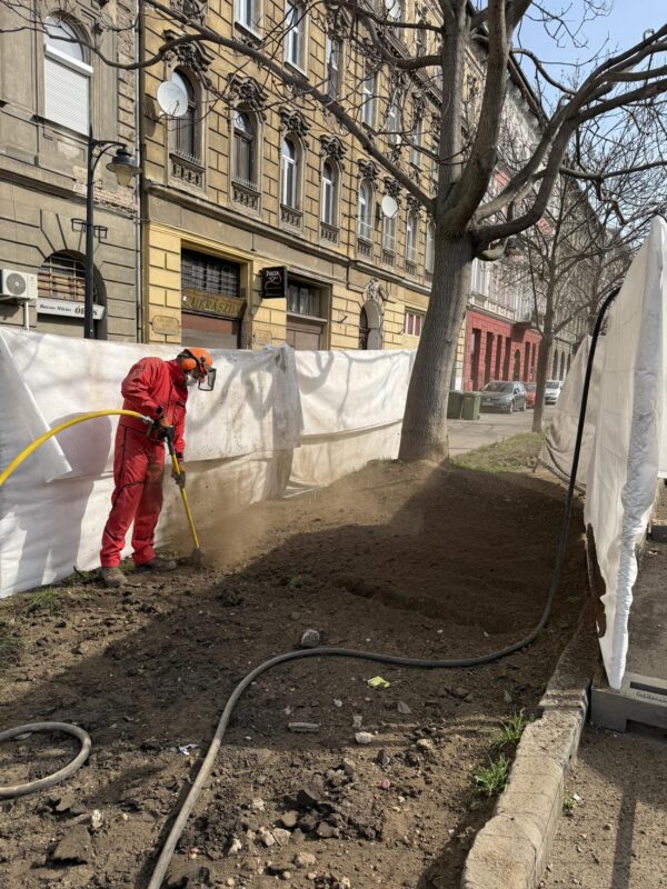 We are starting a special project to protect the trees on Baross utca 120–128. We will use a tool called AirSpade (Air‑Powered Soil Excavation) to help our trees stay healthy.