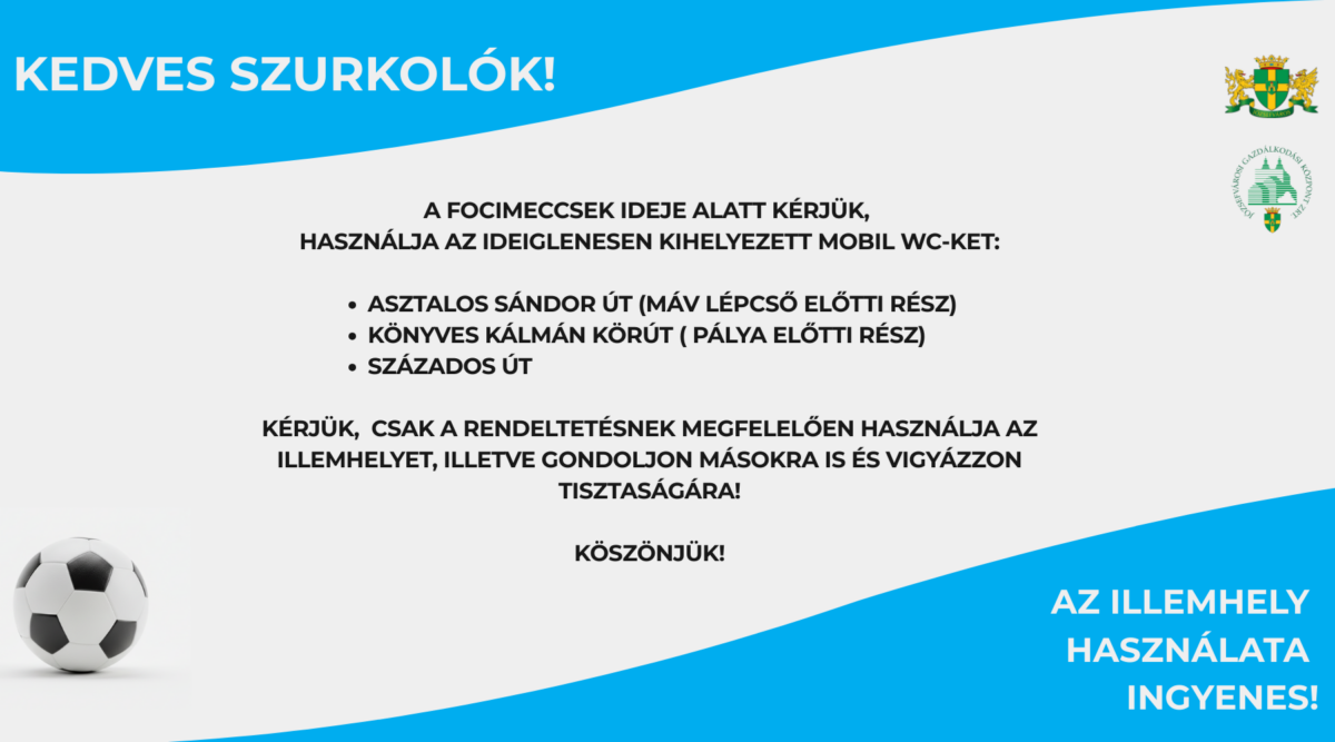 A szurkolók kényelme és a közterületek tisztaságának megőrzése érdekében ideiglenesen négy mobil wc várja majd a szurkolókat. A következő futballmérkőzés során az ideiglenes illemhelyeket a megszokott helyszíneken vehetik igénybe a szurkolók: Kérjük a szurkolókat, hogy vegyék igénybe az illemhelyeket és vigyázzanak a tisztaságra, ezzel is elősegítve a rendezvények zavartalan és kulturált lebonyolítását.