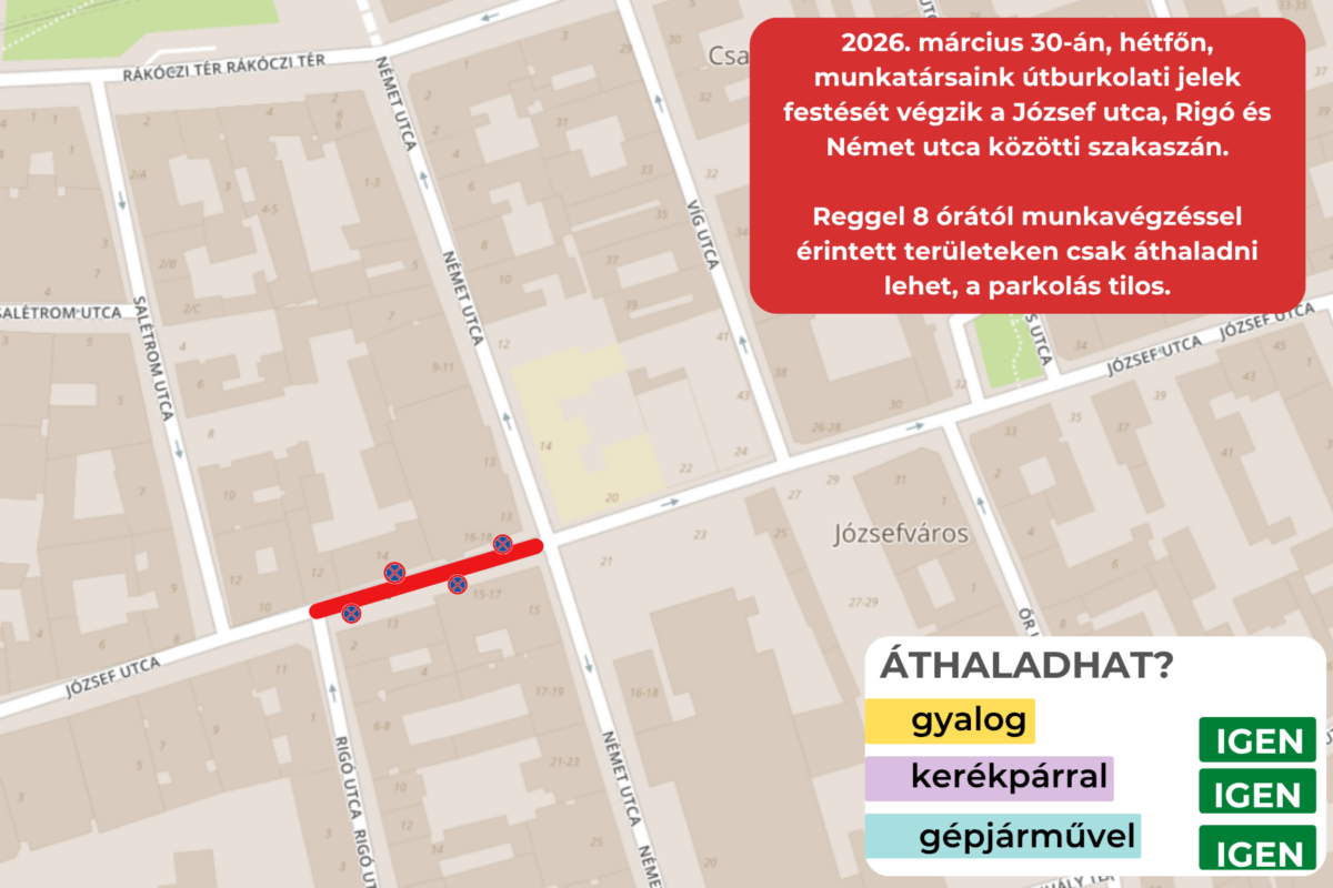 Útburkolati jelek festését végezzük a József utca Rigó utca és Német utca közötti szakaszán március 30-án, valamint a Vajda Péter utca Orczy út és Delej utca közötti szakaszán március 31-én.