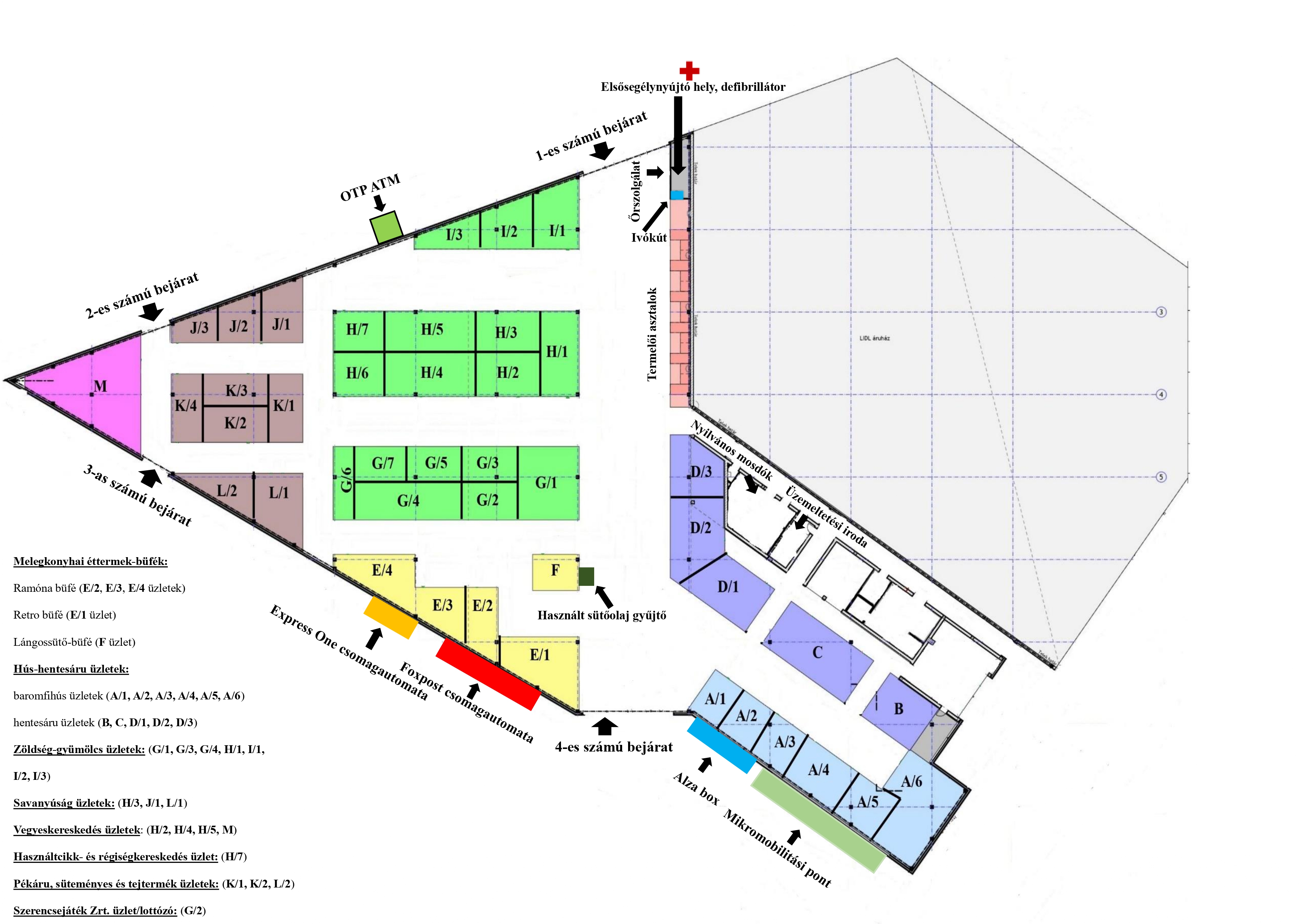 Az üzlethelyiség a piac egyik forgalmas sétányára nyílik, közvetlen utcafronti bejárattal, elektromos fém redőnyökkel. Az üzletben egy egyszerű kézmosó található, egy nagyobb különálló raktérhelyiség, és egy hosszabb kiszolgáló helyiség, valamint a villany- és vízszolgáltatás biztosított. Az állandó piaci nyüzsgés miatt ideális választás bármilyen kereskedelmi tevékenységre, ahol a vásárlói forgalom garantált.